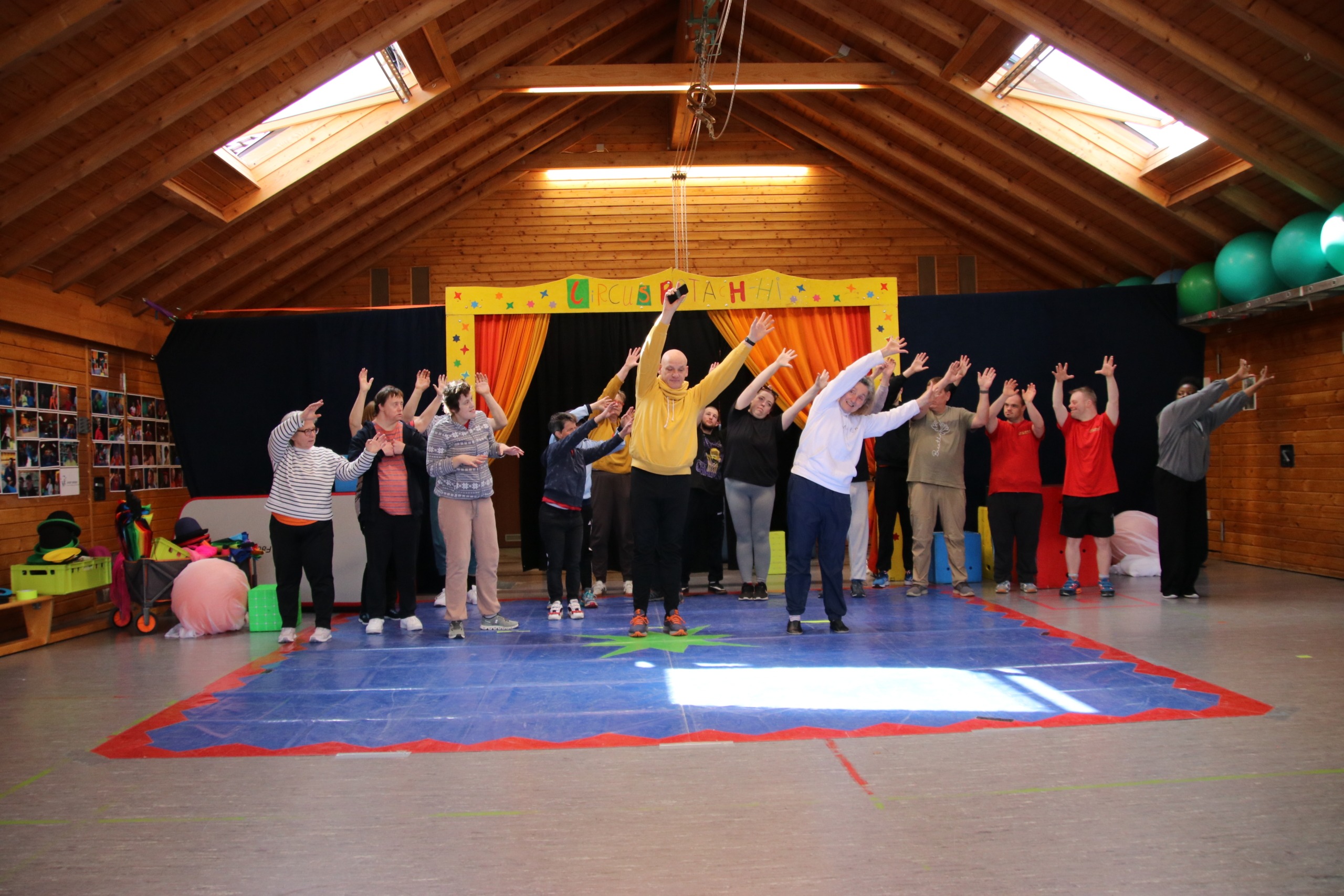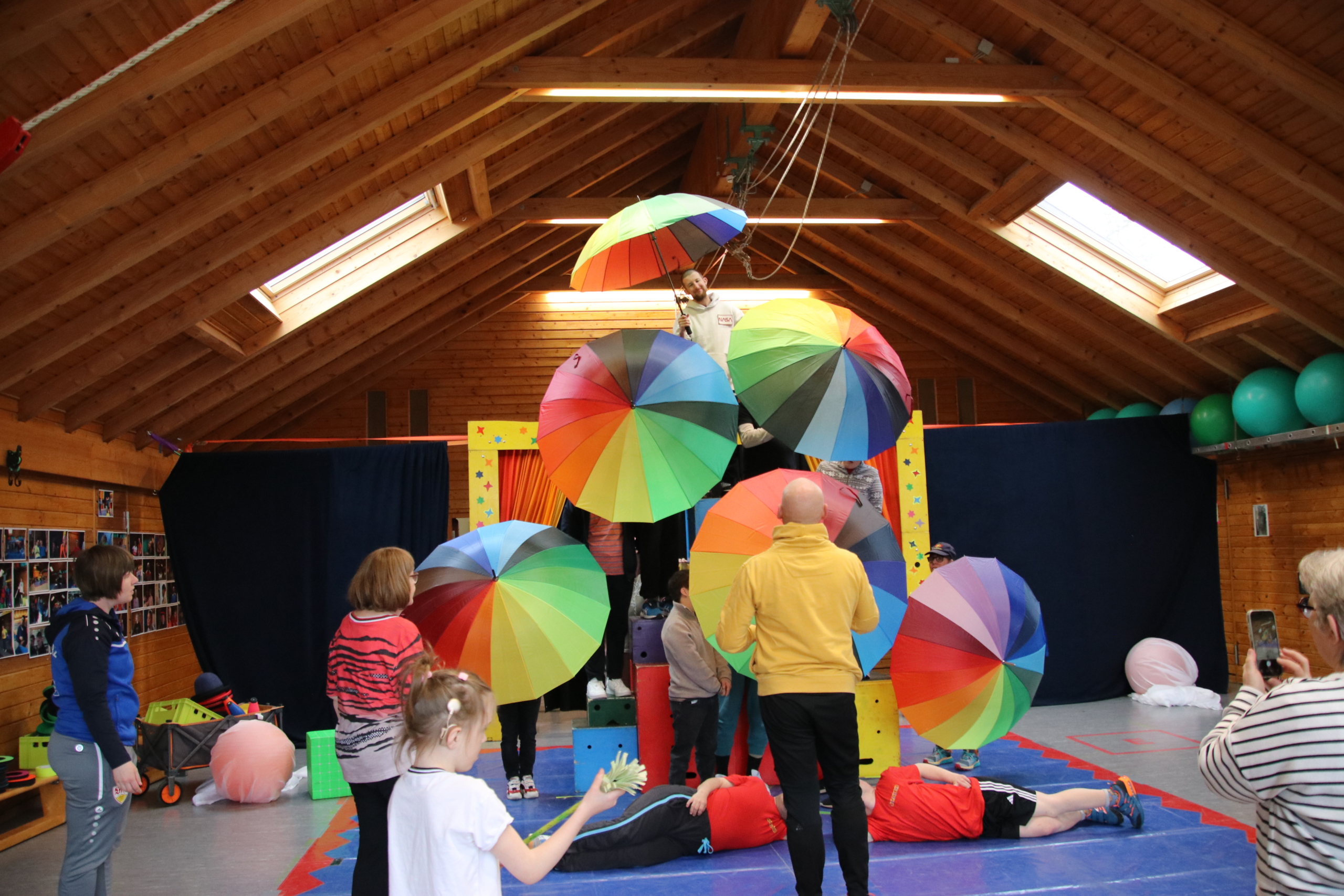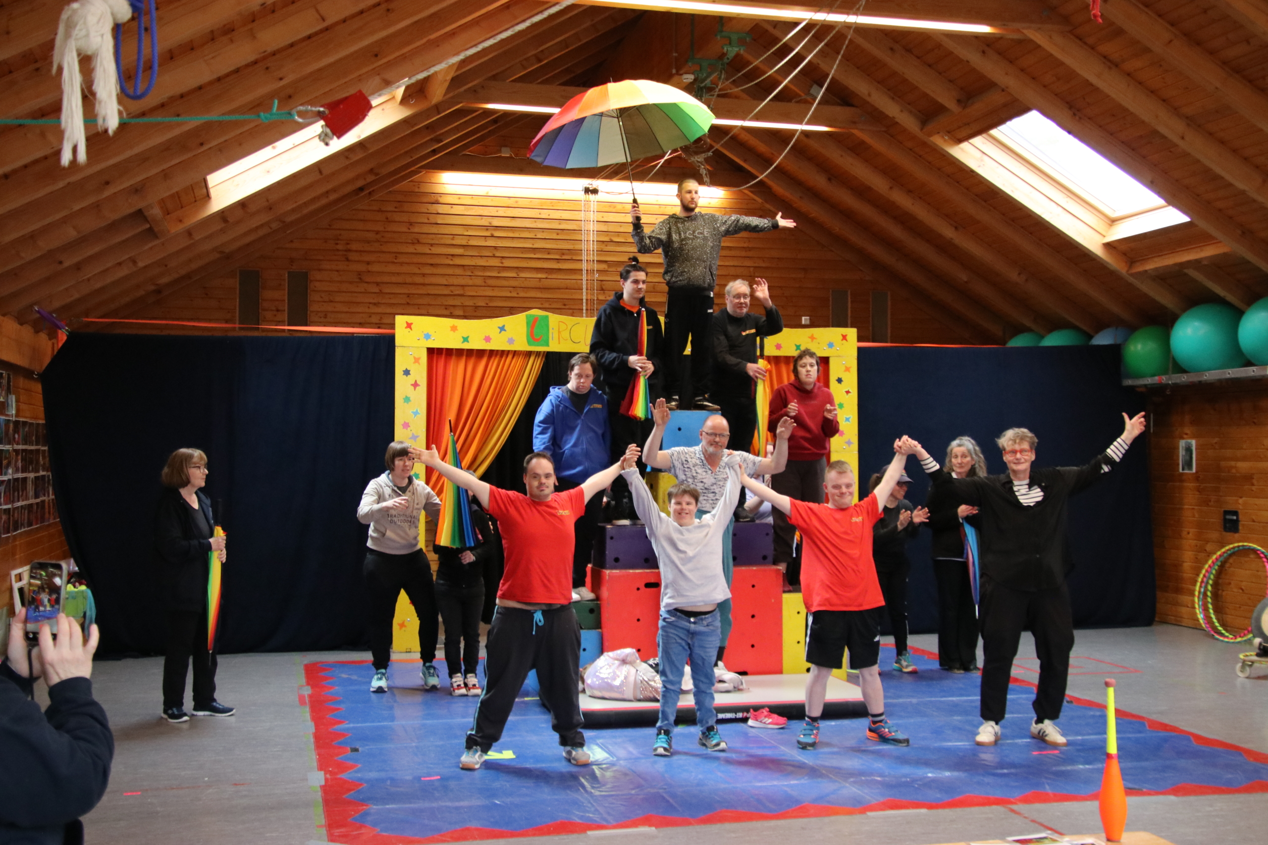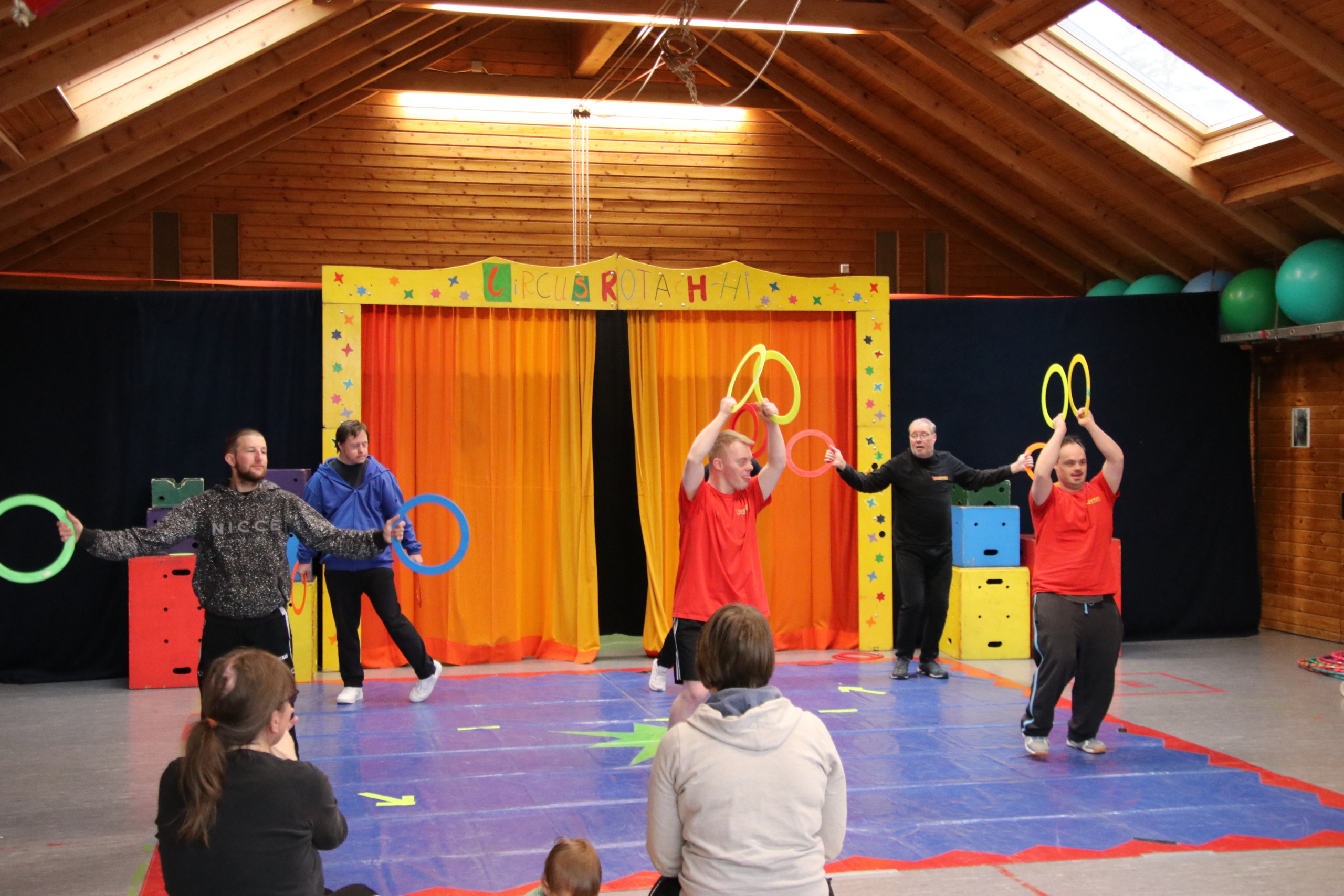 In der Karwoche (30.03.-02.04.) fand in der Bewegungshalle im Haus Höchsten die jährliche inklusive Zirkusfortbildung der Sportkooperation TSG Wilhelmsdorf/ Die Zieglerschen statt. Unter der Leitung von Maik Kretzmar und Silka Thanner erarbeiteten die 20 TeilnehmerInnen mit und ohne Beeinträchtigung ein spannendes Programm, das am Donnerstag dann einem begeisterten Publikum vorgeführt wurde. Neben Akrobatik, Clownerie, Jonglage und Tanz, gehörte auch eine Schwarzlicht-Illusion zum Programm. Bereits am Freitag den 27.03. fand ein inklusiver Tanzworkshop mit Maik Kretzmar statt. Die Veranstaltung, die vom Aktion Mensch geförderten Projekt Sport.Vereint organisiert und durchgeführt wurde, richtete sich an tanzbegeisterte SportlerInnen. Die dort erlernten Choreografien und Tänze bekam die Zuschauer ebenfalls in der großen Aufführung am Donnerstag zu sehen.