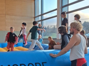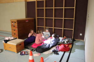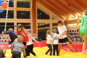 Bei uns gibt es Bewegungsangebote in Gerätelandschaften. Hier können die Kinder ihre kreativen Ideen verwirklichen. Bei den älteren Kindern geht es zusätzlich immer wieder um einzelne Sportarten. Wir probieren alles aus. Zu den Hallenzeiten haben wir immer zwei Gruppen. Was jedoch funktioniert, da wir mit den Gruppen im sechswöchigen Wechsel in der Schwimmhalle bzw. Turnhalle sind.